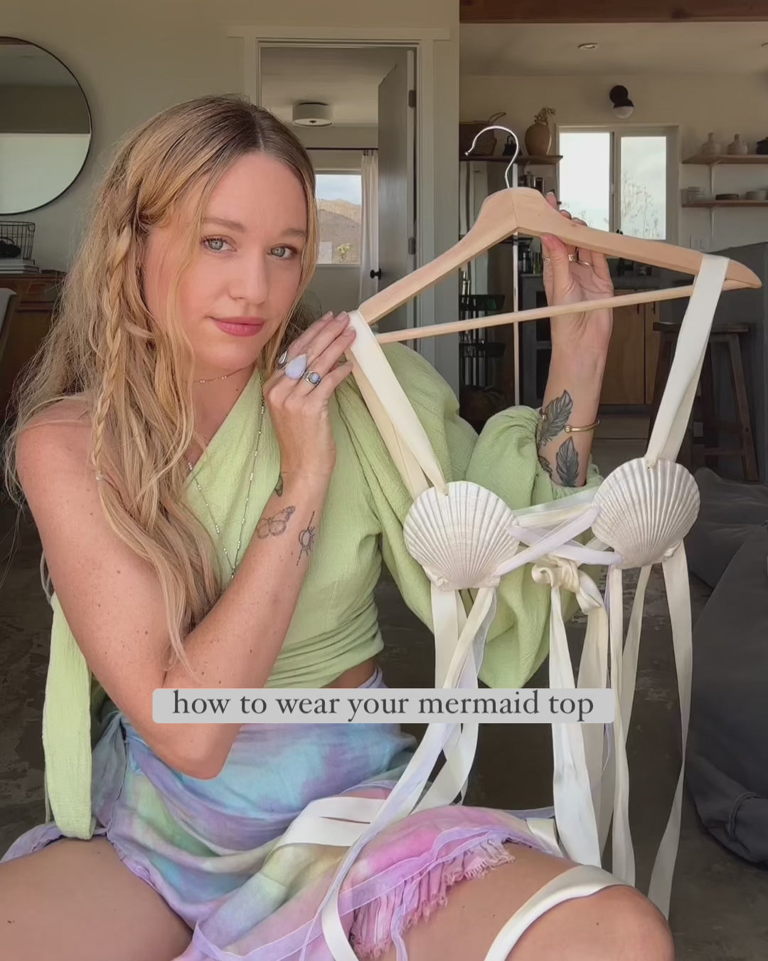 This design is one of my favorite pieces to date! Hand painted real seashells and ivory ribbon piece together this top made for a mermaid. Wear it on its own or styled over dresses and under jackets. It's a versatile piece designed to be wrapped around your body in creative ways.